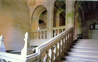 Desde el Claustro de las Procesiones se accede, a través de una puerta de cristal, a la Escalera principal, obra barroca monumental construida entre 1747 y 1749 en tiempos del P. Feijóo, siendo abad el Padre Salcedo. Es de atrevida grandiosidad palatina y de gran audacia en su construcción al evitar los soportes perpendiculares y quedar sus plantas al aire.